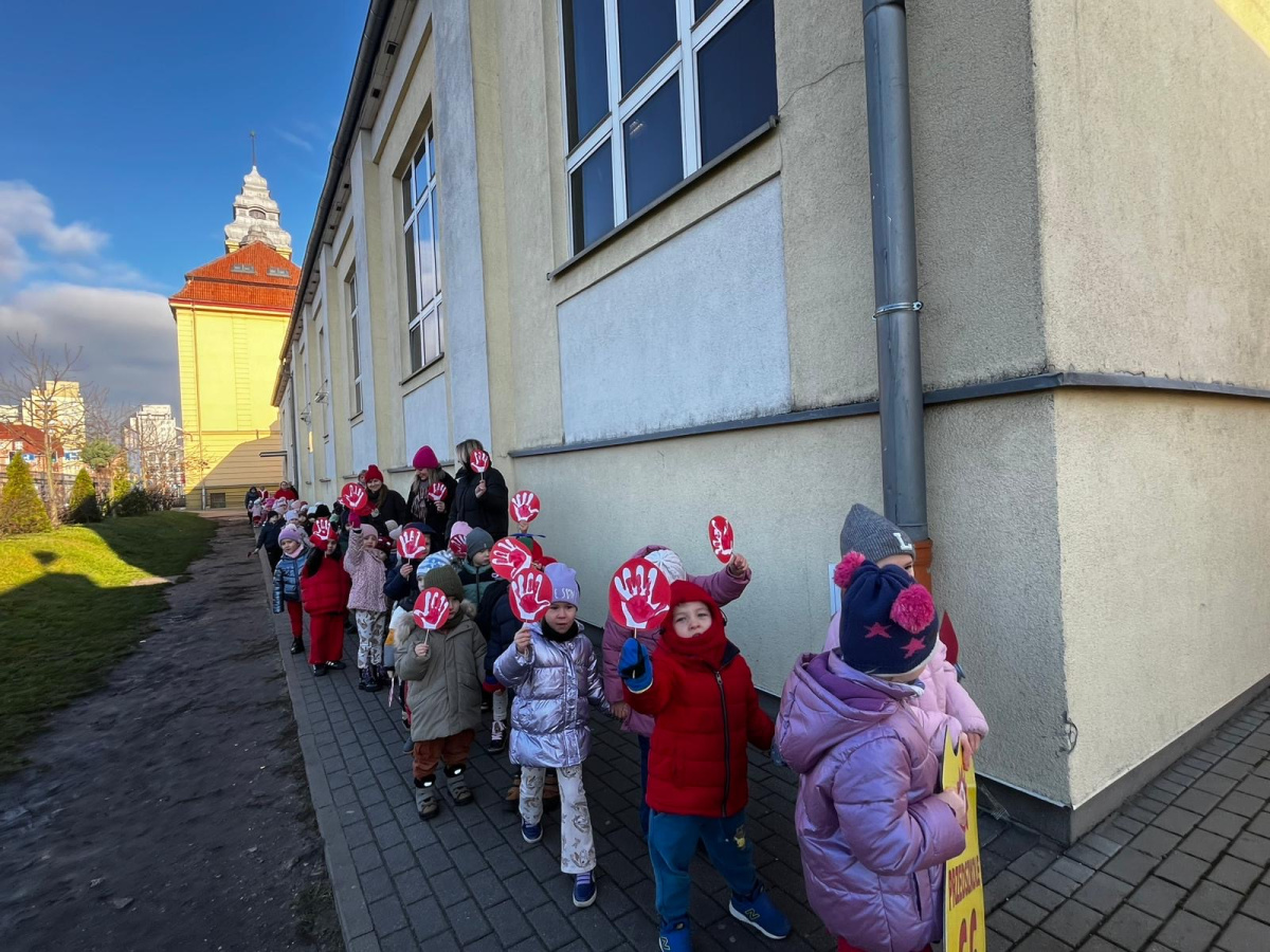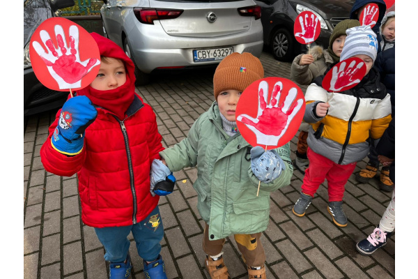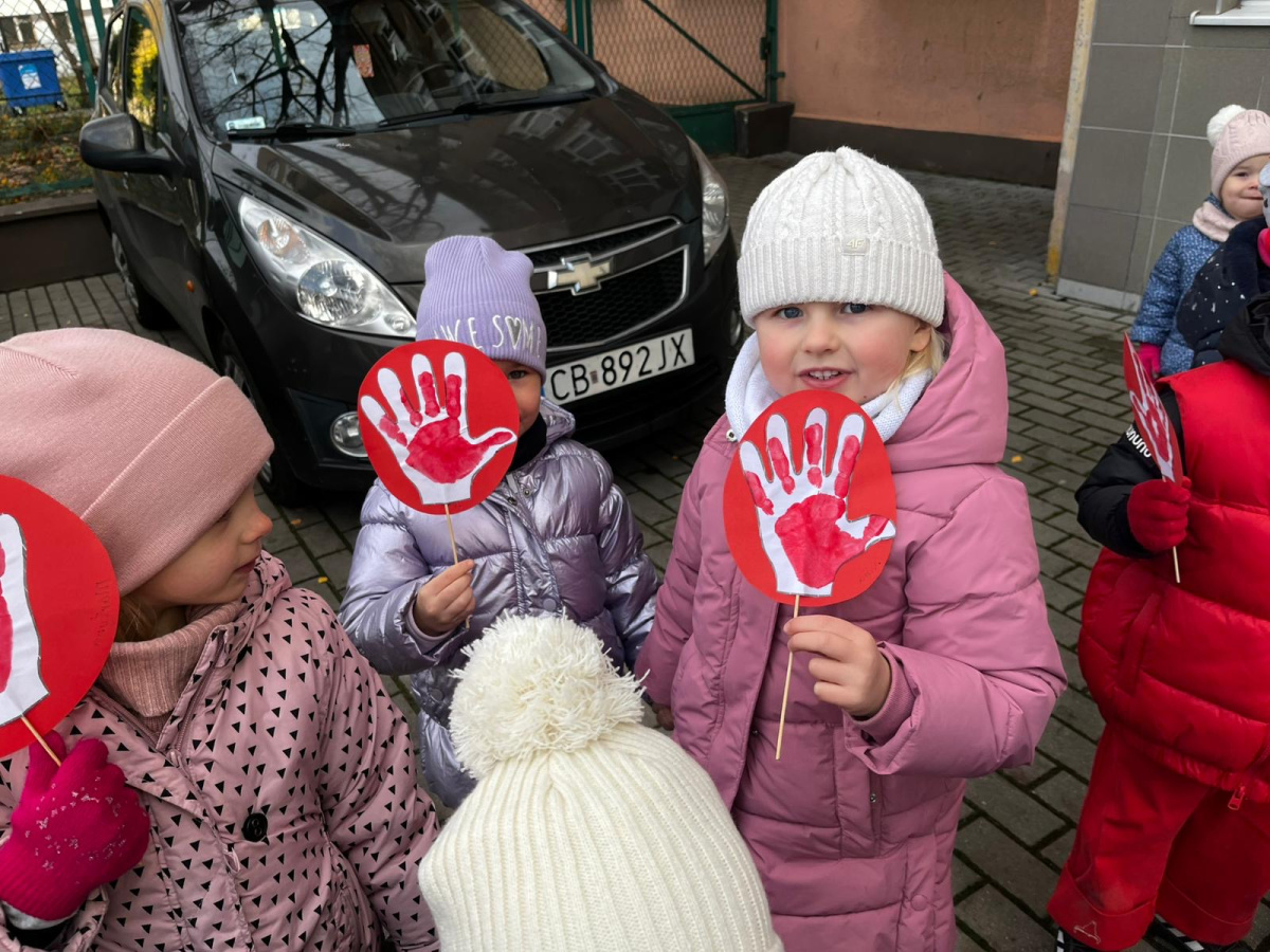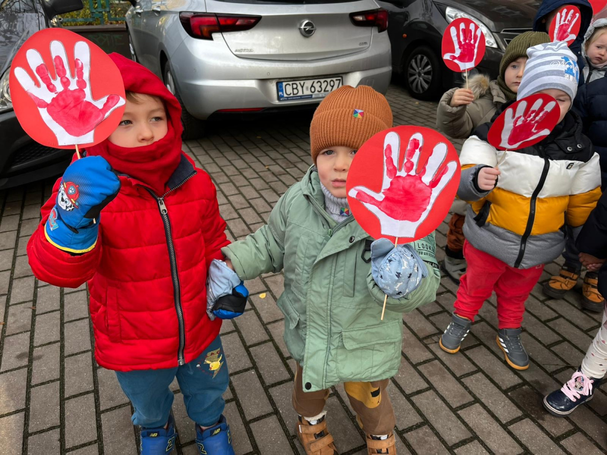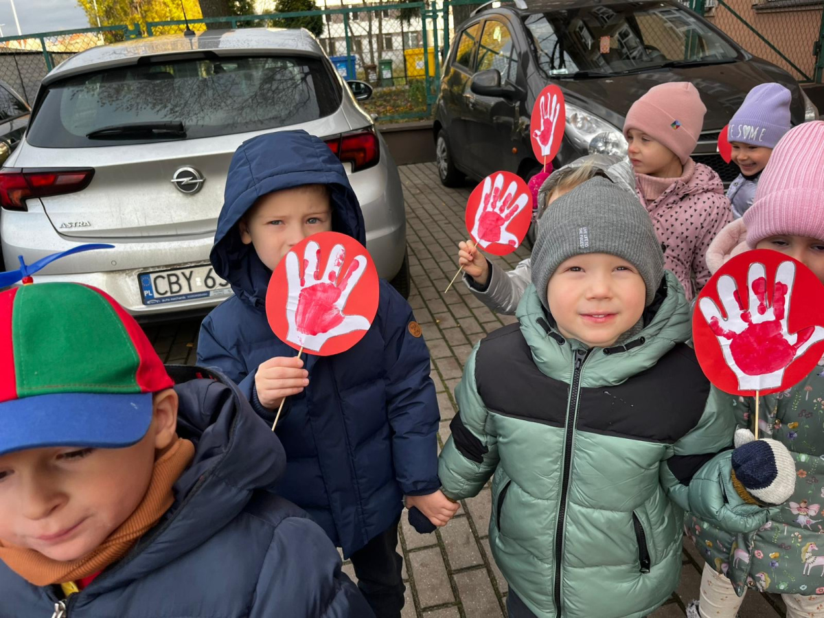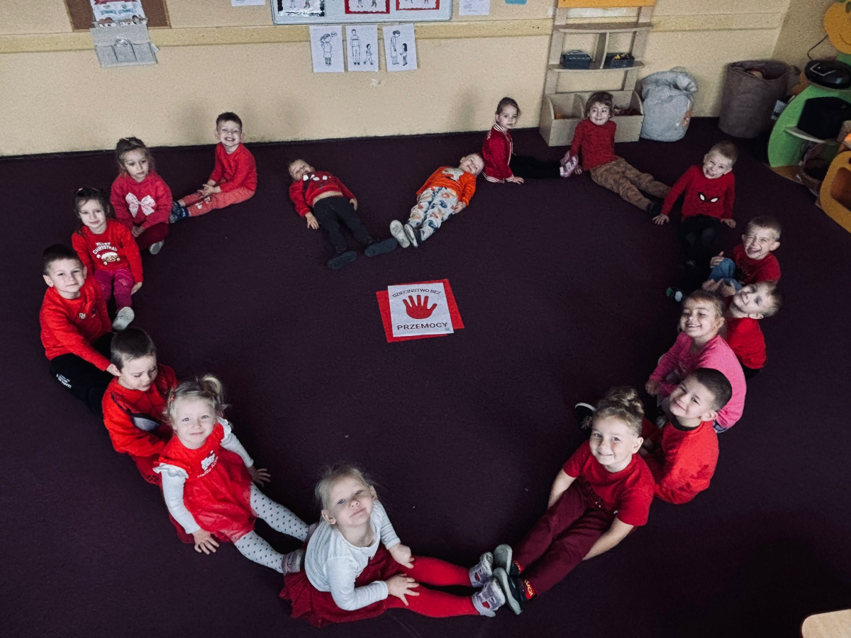1) Kulminacją działań był marsz przeciwko przemocy, w trakcie którego wszystkie dzieci i pracownicy przyszli ubrani na czerwono – kolor symbolizujący sprzeciw wobec wszelkich form krzywdzenia. Wspólne przejście było okazją do podkreślenia, jak ważne jest wspieranie innych i reagowanie, gdy dzieje się komuś krzywda.